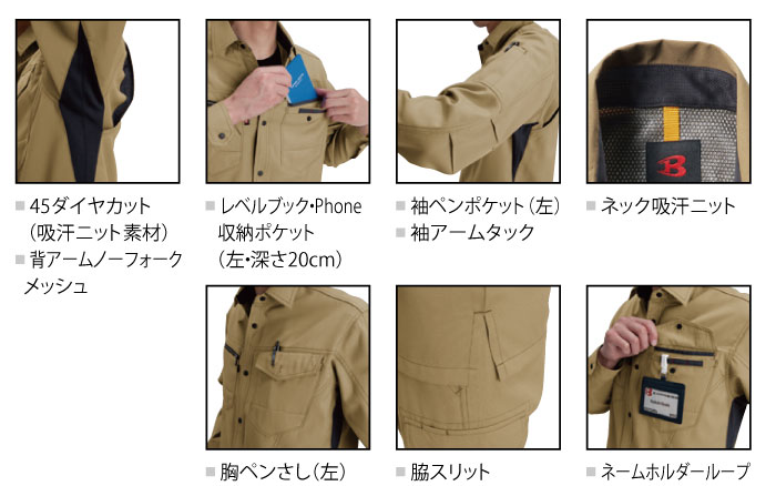 企業ユニフォーム支持率No.1のオールラウンドなワークシーンに対応した作業着です。日本製裏綿ツイルを使用。製品制電JIS T8118適合品です。メカニカルストレッチ機能が動作をスムーズにサポートします。腕の上げ下げがスムーズな独自の脇ダイヤカットを採用。